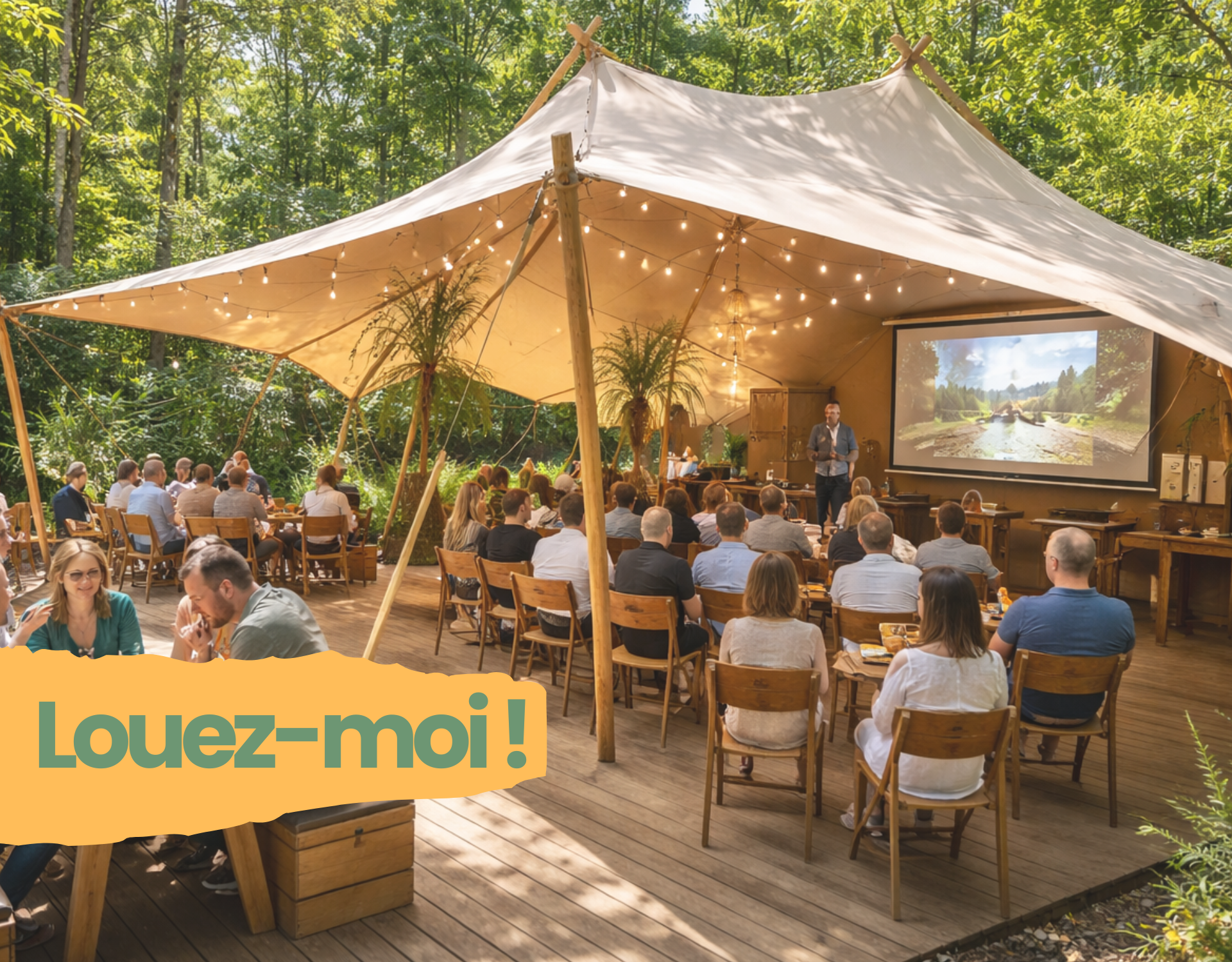En 2026, Opalaventure propose un nouvel espace de réception pour des séminaires au vert ! Une tente entièrement équipée au cœur de la forêt.